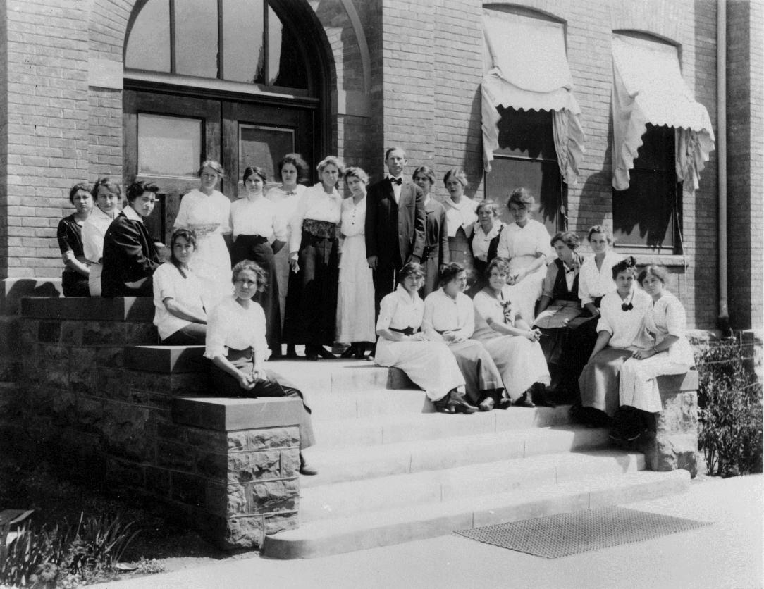 Under Principal Bradford Farmer (so that’s where the Farmer Building’s name comes from), English coursework focused on recitations and “rhetoricals” or debates; upon its opening, the library had one book—a dictionary. The first syllabus (1890-91) expanded the English offerings to include reading, rhetoric, grammar, English and American literature, orthography (spelling), and “word analysis.” In 1898, all classes were held in what is now called “Old Main” and the Original Building housed the Training School.