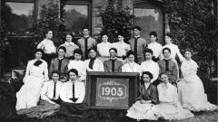 Image 5: The 1905 senior class of Tempe Normal School poses outside Old Main. Photo from ASU General Catalog, 1905-1906.